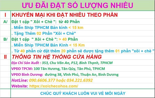 Lưu ý, ưu đãi trên chỉ áp dụng cho các đơn hàng chỉ bao gồm xôi + chè, không dành cho các sản phẩm khác như gà, vịt, cháo, gỏi, đồ cúng, trầu cau, hoa quả, bánh,…