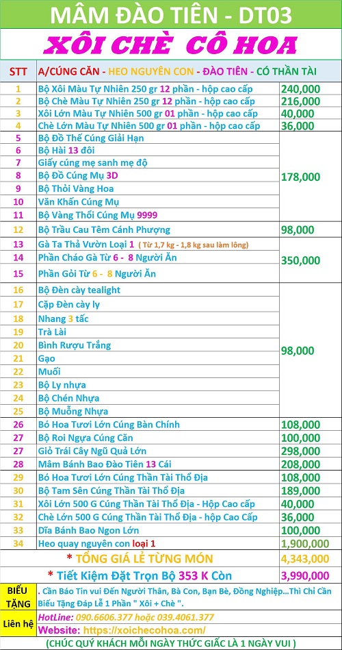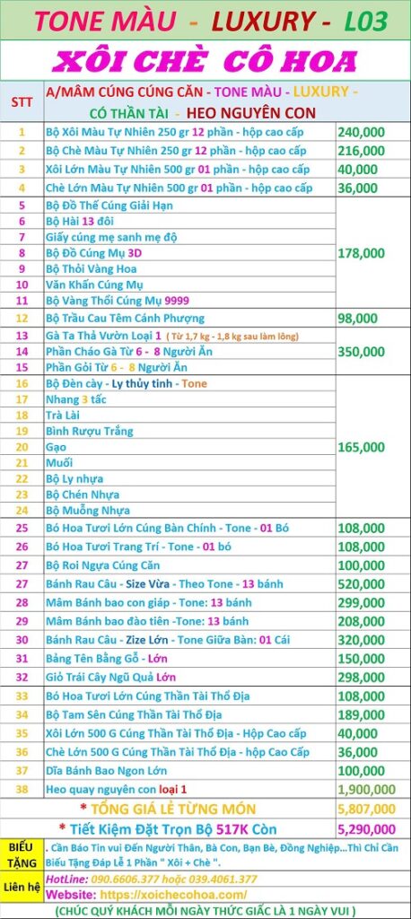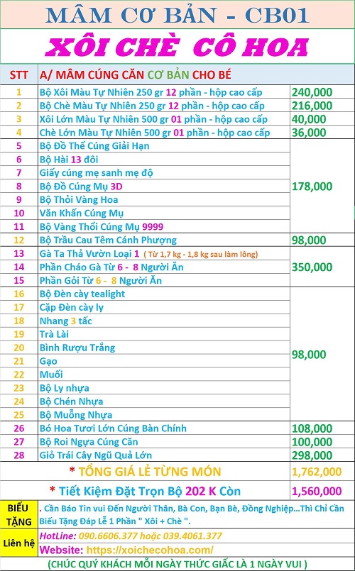 – Do những lê vật cúng căn cho bé trai 3 tuổi là những lễ vật không máy xa trong cuộc sống hằng ngày, những lễ vật này mỗi cha mẹ cháu bé có thể đã có vài món nên sẽ có nhu cầu chỉ cần mua bổ sung những vật lễ chưa có. Vì thế để đáp ứng nhu cầu của quý khách cửa hàng cô Hoa chè có cúng cấp giá bán chi tiết từng món để cho khách hàng lựa chọn phù hợp: