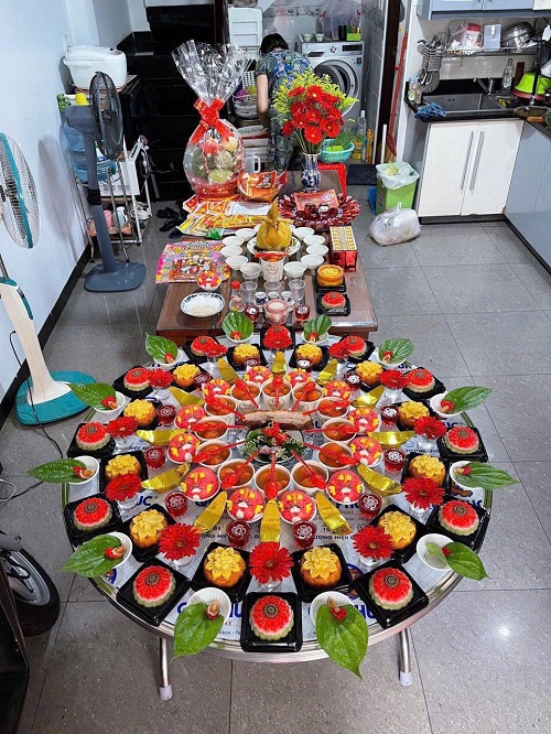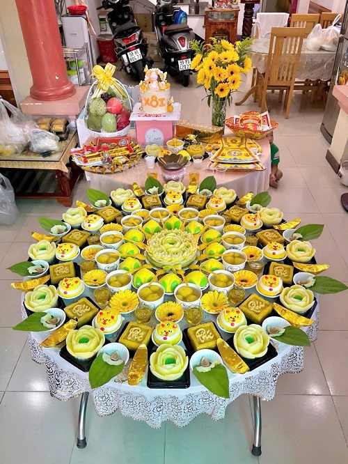 Cúng 1 bộ xôi chè ngọt bao gồm 12 phẩn nhỏ và 1 phần to gấp hai phần nhỏ.