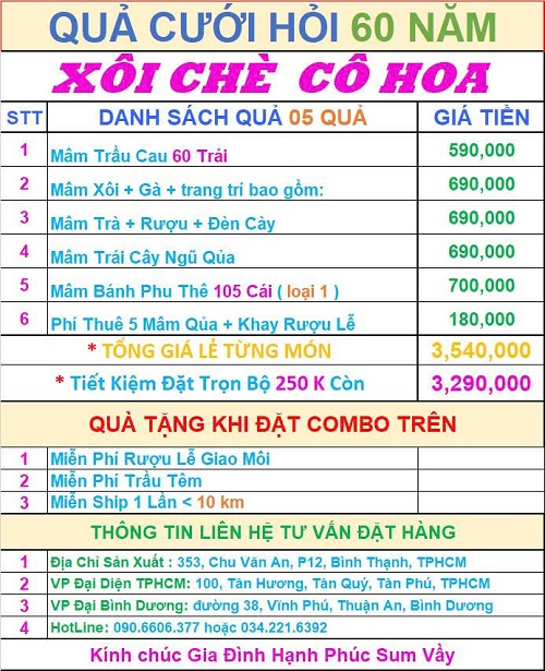 – Hiện giá bán bên trên hình là giá bán xôi chè, các lễ vật còn lại giá bán cụ thể như sau: