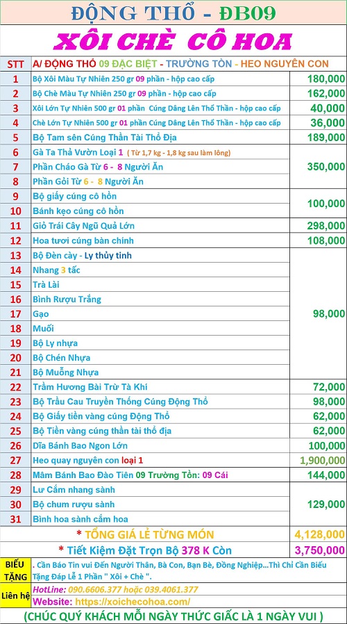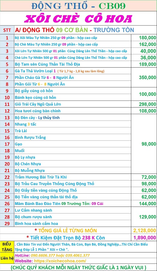 II. GÍA BÁN & CHI TIẾT BỘ LỄ VẬT CÚNG ĐỘNG THỔ SỐ 09 “TRƯỜNG TỒN VĨNH CỬU” CỦA XÔI CHÈ CÔ HOA.