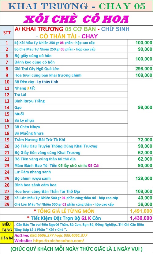 => Để tránh những thiếu sót lễ vật & những món cúng được thơm ngon. Gia đình nên liên hệ cửa hàng Xôi Chè Cô Hoa để được phục vụ tận nơi những món ăn và lễ vật này ngày cúng khai trương.
