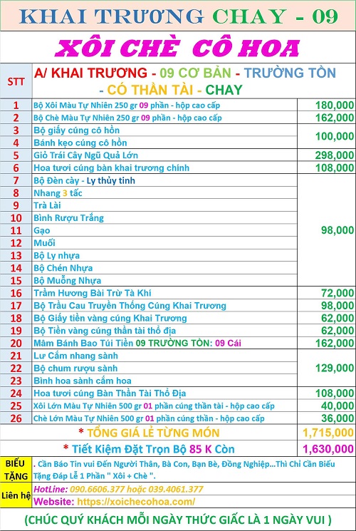 – Bộ Xôi Chè cúng khai trương 09 “Trường Tồn”: