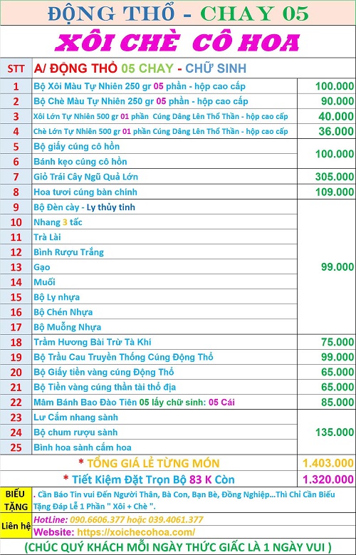 => Để tránh những thiếu sót lễ vật & những món cúng được thơm ngon. Gia đình nên liên hệ cửa hàng Xôi Chè Cô Hoa để được phục vụ tận nơi những món ăn và lễ vật này trong cúng lễ động thổ.