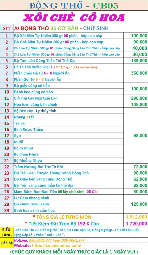 Bảng giá khuyến mãi & chi tiết lễ vật cúng động thổ số 05 lấy chữ “Sinh”.