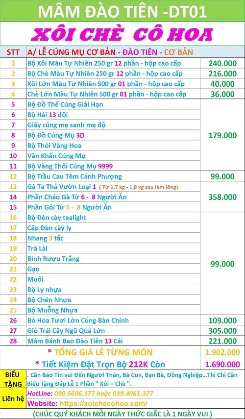 II/ BẢNG GIÁ TRỌN GÓI MÂM ĐÀO TIÊN CÚNG MỤ TẠI XÔI CHÈ CÔ HOA