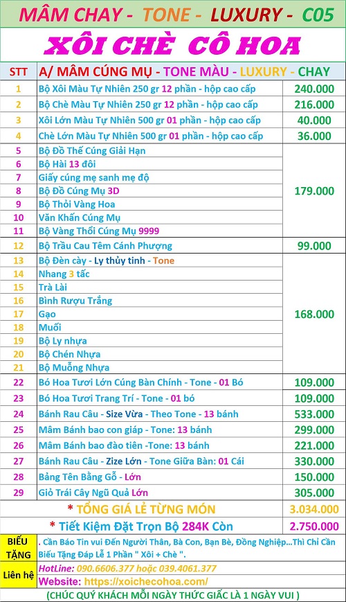 II/ BẢNG GIÁ BÁN TRỌN GÓI MÂM LUXURY CHAY TẠI XÔI CHÈ CÔ HOA